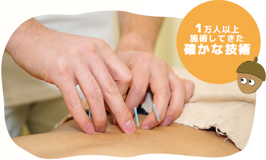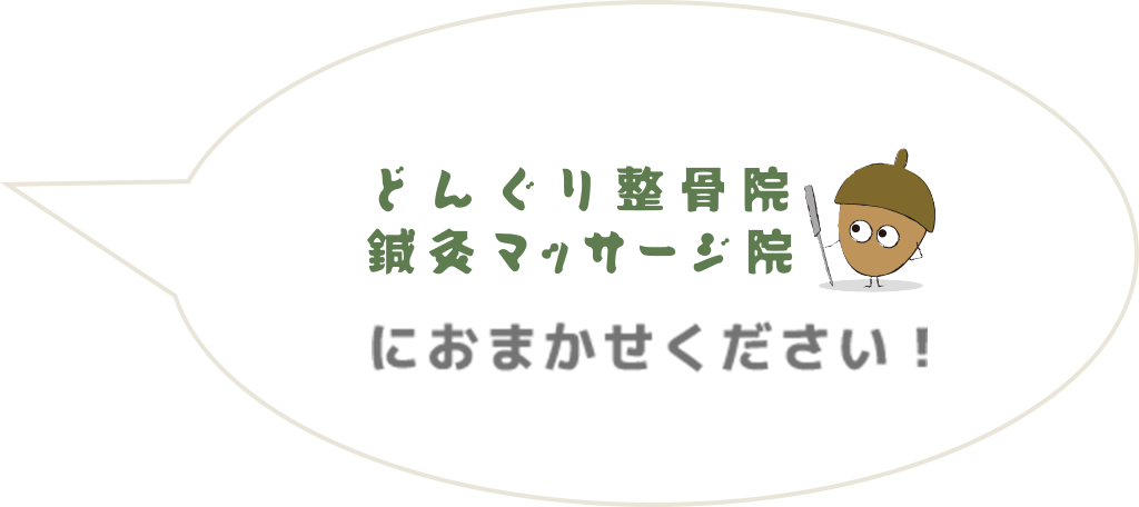 どんぐり整骨院ではあなたに合った施術を提案して施術をおこないます。 筋肉、神経、ツボにアプローチをして痛みを改善し、根本の歪みを正し、 痛みの出ない身体づくりを目指します。