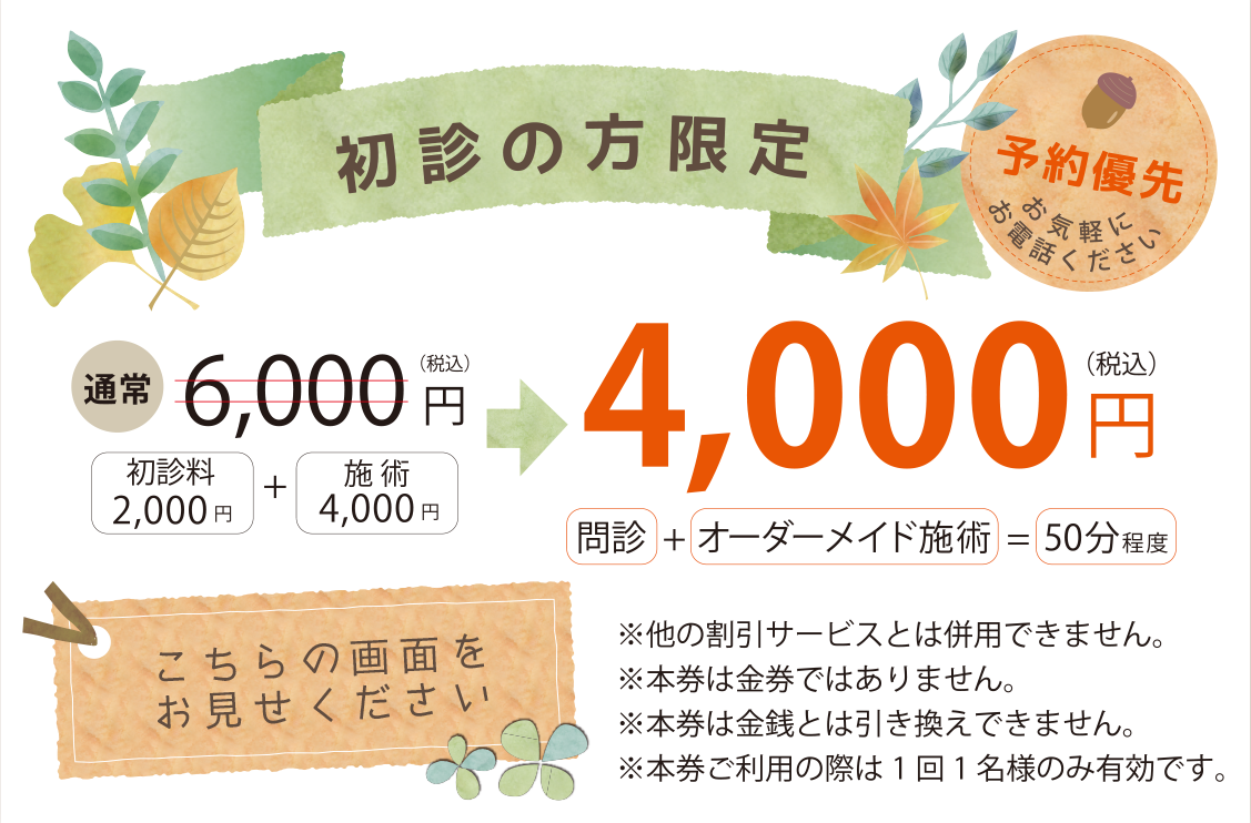 施術当日、受付にてカウンセリングシートを受け取っていただき、お身体でお悩みの場所や症状について記入をお願いいたします。
